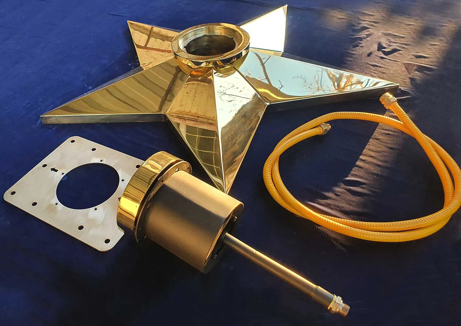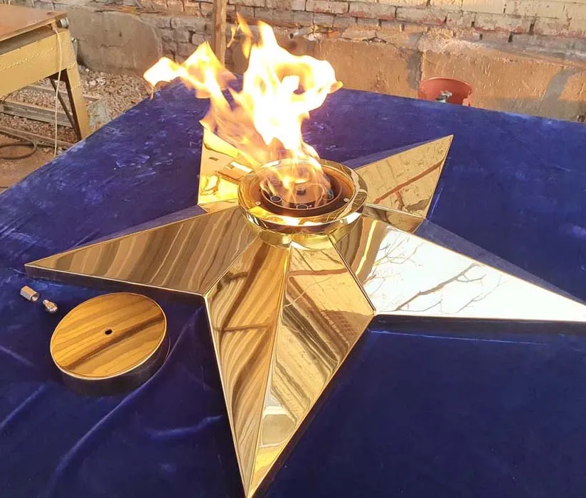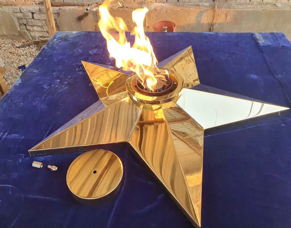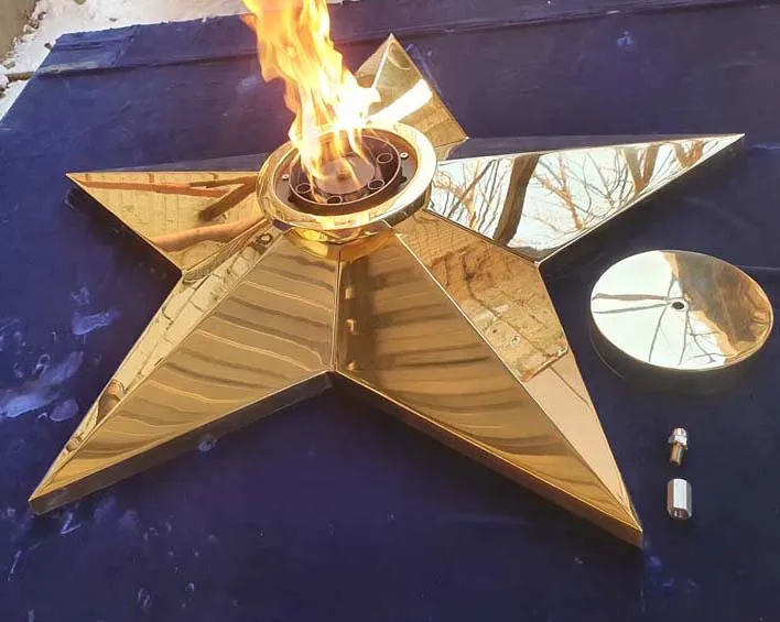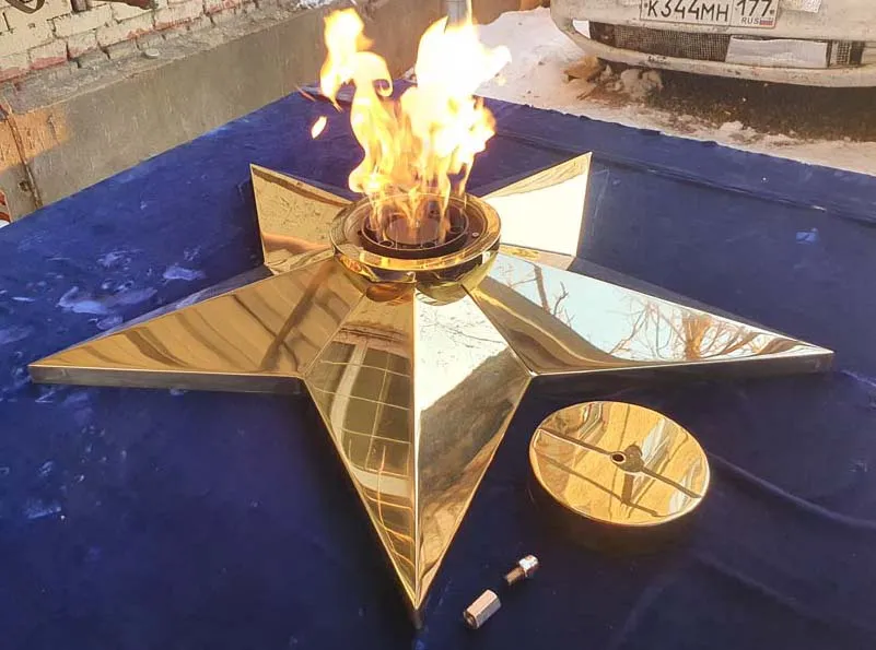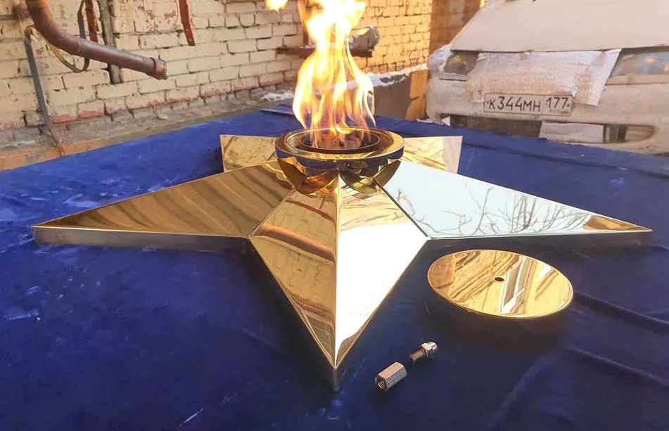 Звезда вечного огня из листовой латуни латуни марки Л63. Толщина листового металла 3не меньше чем 3 миллиметра. Диаметр звезды вечного огня 1100 миллиметров, высота пол центральной оси 140 миллиметров. Звезду характеризует удобный монтаж - на декоративную плиту сначала крепится установочная пластина через отверстия по периметру, затем через  горловину производится монтаж самой звезды.  И только затем в горловину звезды устанавливается газовая горелка. Пламя горелки горит над верхним срезом звезды, что позволяет уберечь корпус звезды от повреждений огнём. Комплектуется звезда ветроустойчивой газовой горелкой серии ГВД 379 10 89 00 ПС