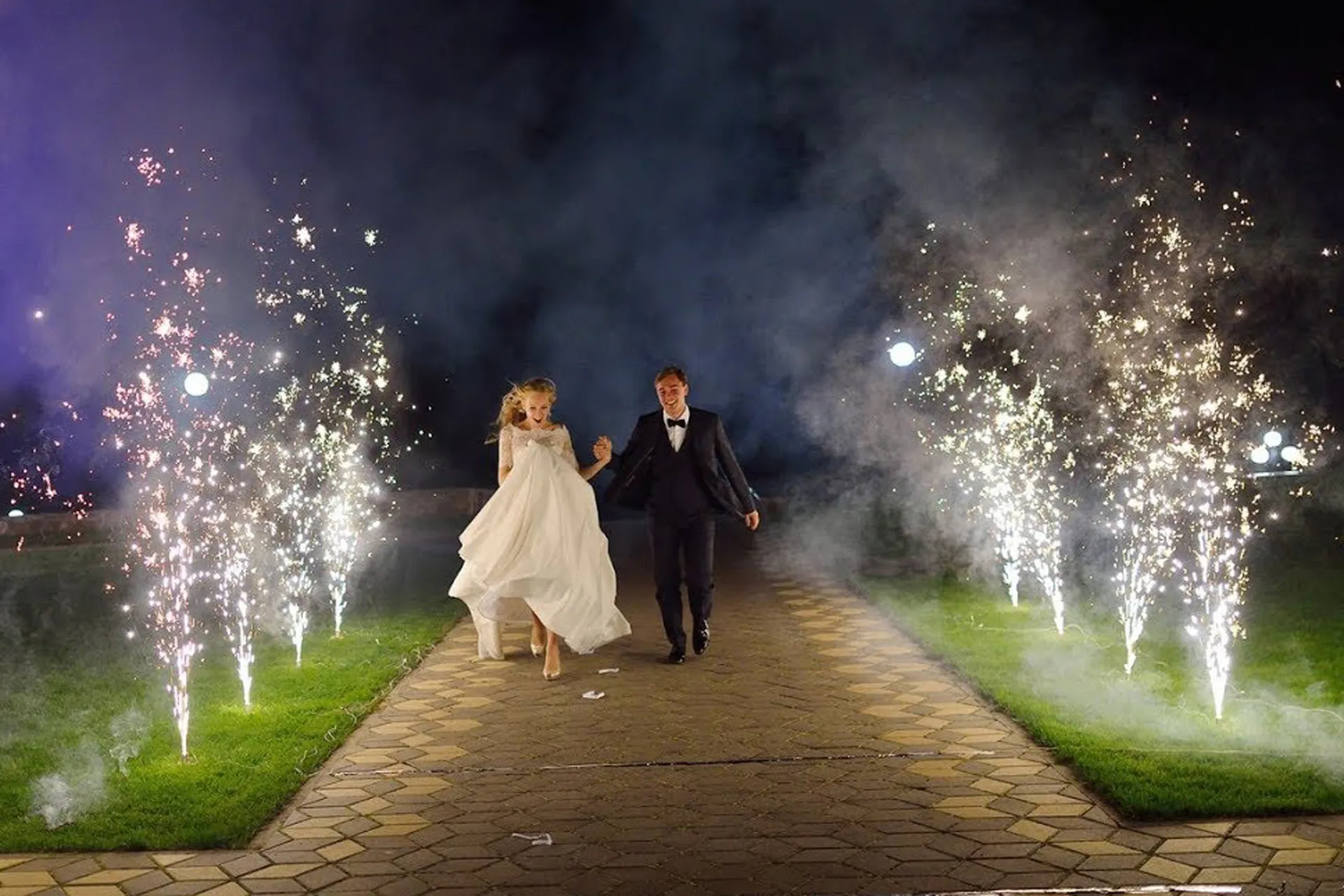 Сегодня в Москве стало традицией пиротехническое шоу на праздник – услуга запускать фейерверки на свадьбу пользуется устойчивым спросом на протяжении многих лет. Кроме салюта в финале мероприятия, существует множество пиротехнических эффектов для создания динамического фейерверк шоу на протяжении всего свадебного торжества. На свадьбе красиво и уместно смотрятся яркие композиции из пиротехнических фонтанов в форме огненной дорожки. По стоимости пиротехническая дорожка из фонтанов с холодной искрой обойдется дешевле, чем парковый или высотный салют - фейерверк, но по зрелищности не уступает полномасштабному салюту в небе. Прекрасное и романтичное свадебное торжество легко украсит дорожка из холодных фейерверков, переливающаяся золотыми искрами и сопровождающая молодых в финале свадебного танца. Огненная пиротехническая дорожка послужит символом начала совместного пути молодых по жизни и надолго запомнится гостям свадебного торжества..